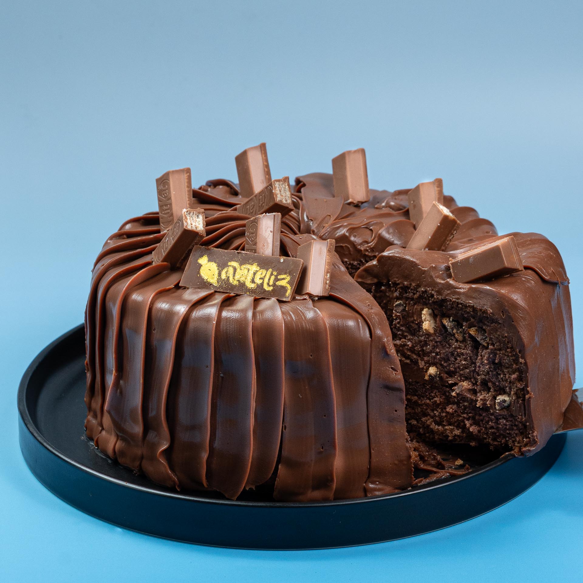 Bizcocho de chocolate, humedecido en tres leches de chocolate, relleno de ganache de chocolate y galletas de chips de chocolate, decorado con ganache de chocolate y kit kat.