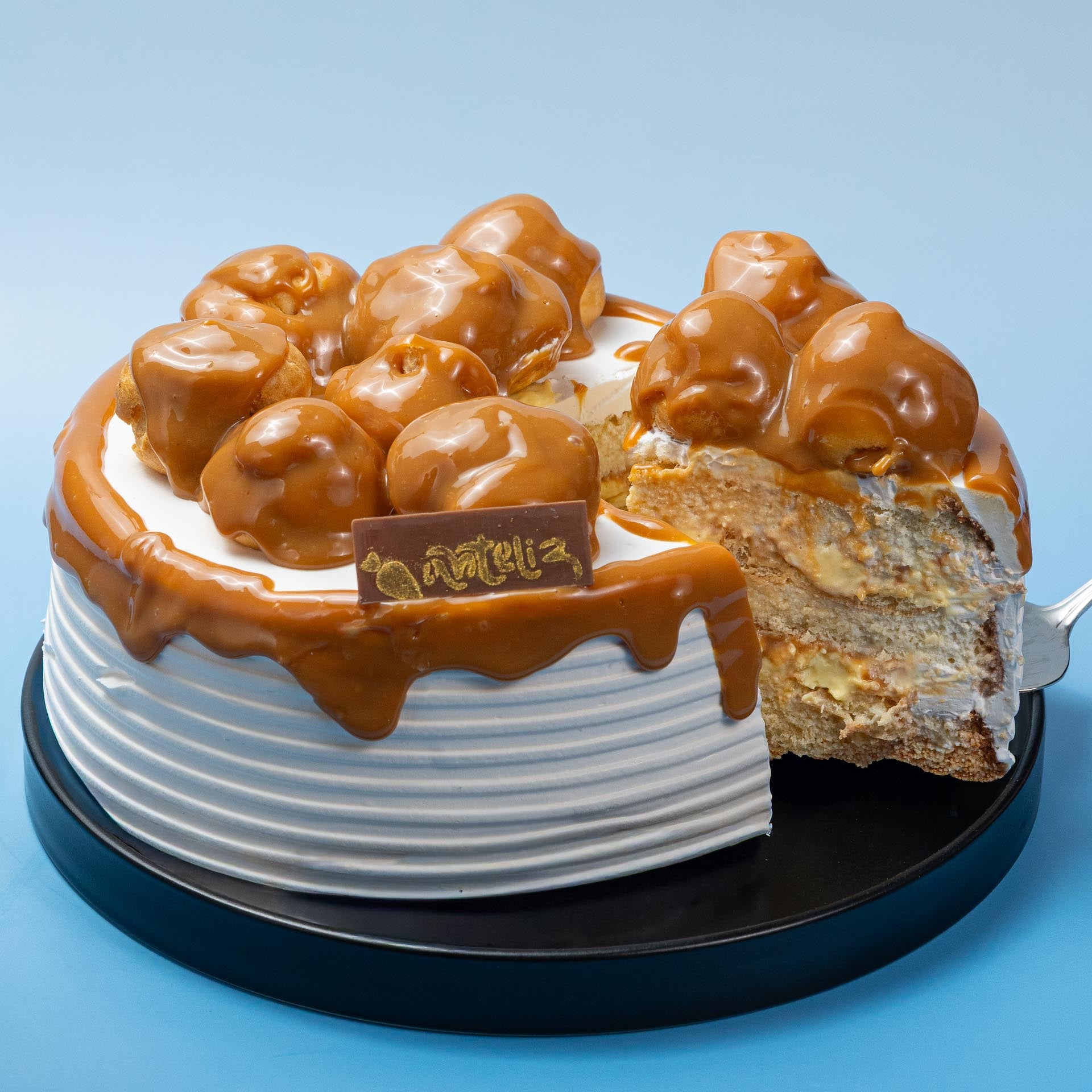 Bizcocho de vainilla humedecido en tres leches, relleno de profiteroles, crema pastelera y manjar, cubierto de crema chantilly, decorado con profiteroles rellenos de crema pastelera y topping de manjar.